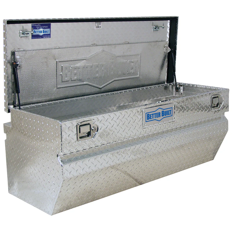 Maximize your visibility. This BETTER BUILT® Chest Truck Tool Box sits below the bed rails, making it compatible with tonneau covers. The chest features easy-to-use paddle handles that provide security for your items. The offset hinge allows your lid to open nearly 90 degrees, even while sitting flush against your truck cab. Use this box in your truck or for household storage to make it convenient to transfer items. The full seal weather stripping helps prevent elements from getting into the truck box and the self-adjusting strikers are guided to their latch every time to provide a secure closure. The self-rising gas springs allow easy single handed entry to the box. This box is backed by a 1 year limited warranty.